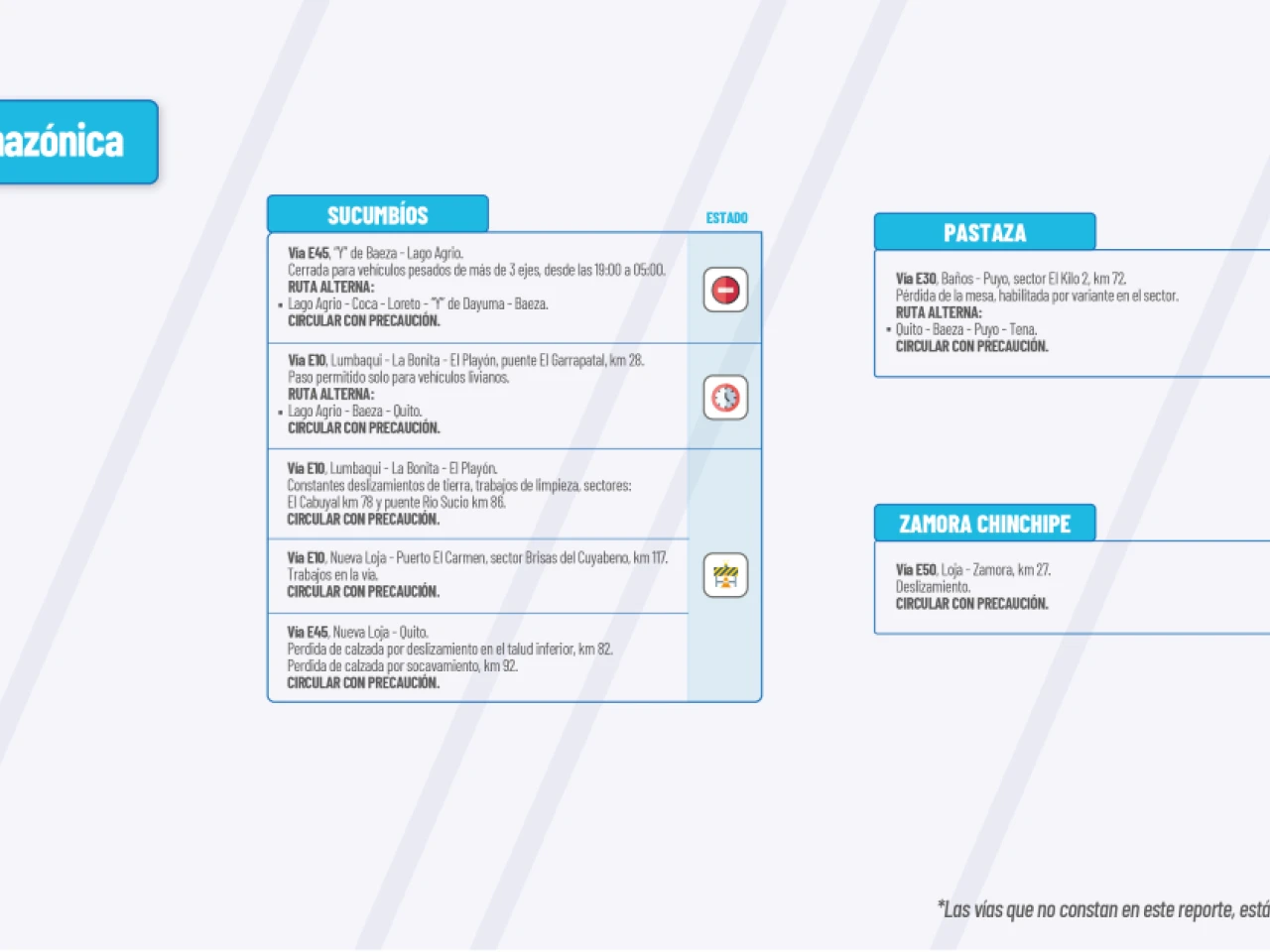 El Ministerio de Transporte y Obras Públicas (MTOP) en su cuenta de X publica el estado de las vías de la Amazonía ecuatoriana. A continuación, compartimos información que le podría interesar.