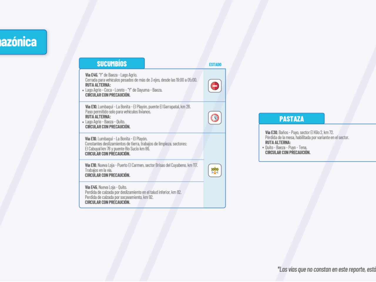 Vía E45: Pérdida de calzada: “Y” de Baeza - “Y” de Narupa, sector Cocodrilos Km 45. “Y” de Baeza-El Chaco, sector quebrada Macanas. “Y” de Baeza-El Reventador-Nueva Loja, sector Santa Rosa-Tres Cruces. Circular con Precaución.