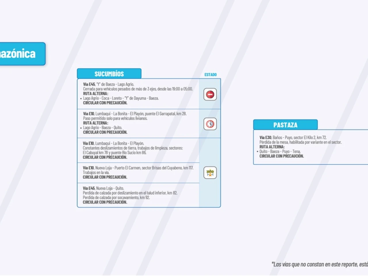 Vía E10:?Lumbaqui-La Bonita-El Playón. Constantes deslizamientos de tierra, trabajos de limpieza sectores: El Cabuyal km 78, puente Río Sucio Km 86. Circular con precaución.
