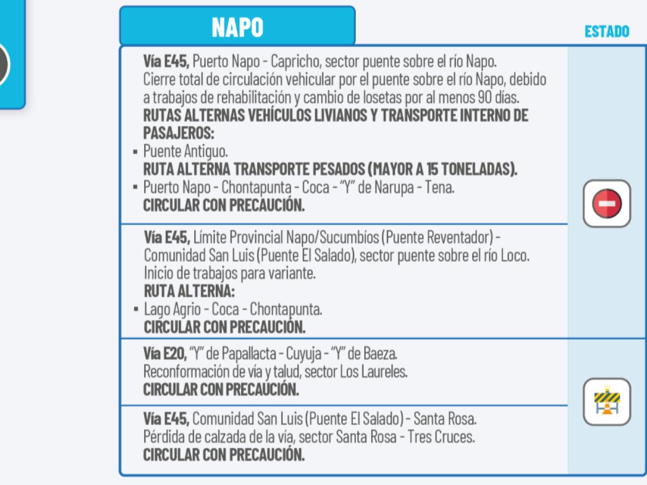 Vía E45: Puerto Napo-Capricho, sector puente sobre el río Napo. Cierre total de circulación vehicular por el puente sobre el río Napo, debido a trabajos de rehabilitación y cambio de losetas por al menos 90 días.