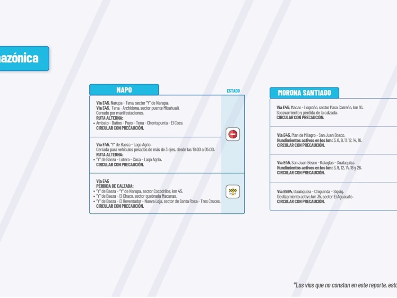 El Ministerio de Transporte y Obras Públicas (MTOP) en su cuenta de X publica el estado de las vías de la Amazonía ecuatoriana. A continuación, compartimos información que le podría interesar.
