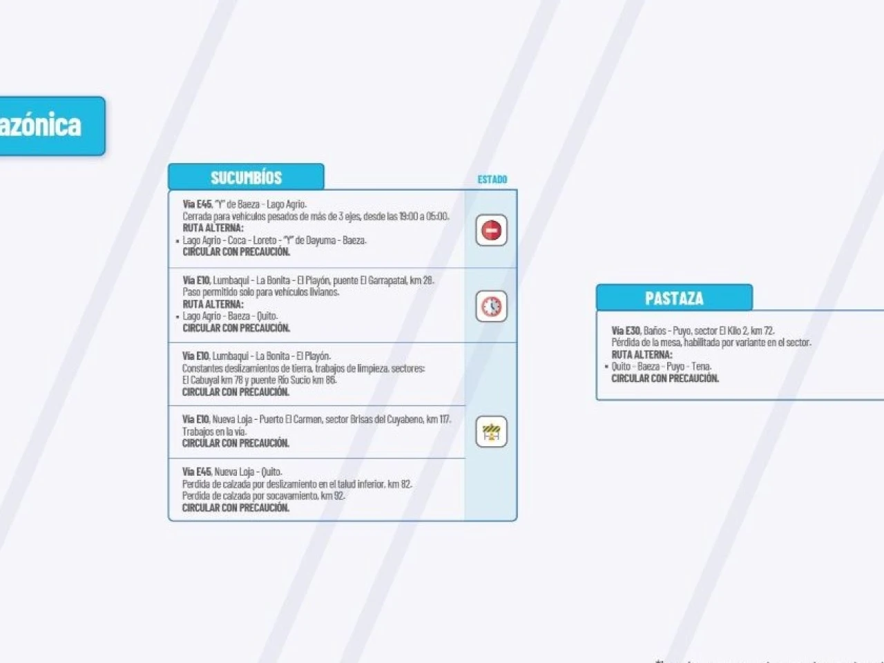 El Ministerio de Transporte y Obras Públicas (MTOP) en su cuenta de X publica el estado de las vías de la Amazonía ecuatoriana. A continuación, compartimos información que le podría interesar.