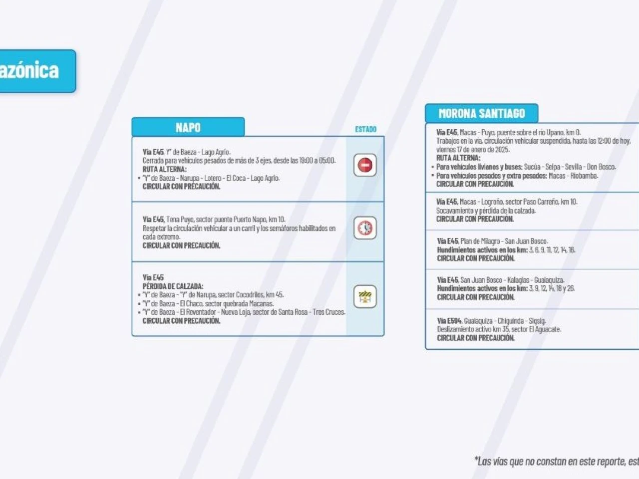 Vía E45:?San Juan Bosco-Kalaglas-Gualaquiza.? Hundimientos activos: km 3, km 9, km 12, km 14, km 18 y km 26.? Circular con Precaución.