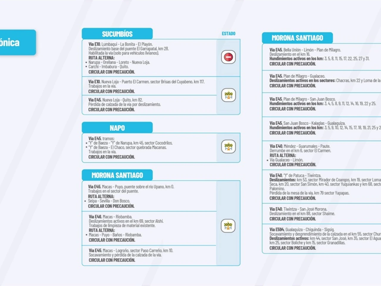 Vía E45: San Juan Bosco-Kalaglas-Gualaquiza. Hundimientos activos: km2, km5 km 9, km 10, km 12, km 14, km 15, km 17, km 18, km 19, km 21, km 25, y km 26. Circular con Precaución.