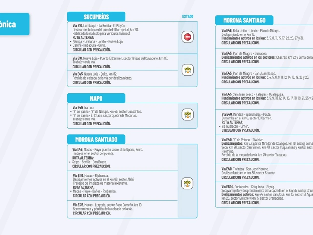 Vía E45: San Juan Bosco-Kalaglas-Gualaquiza. Hundimientos activos: km2, km5 km 9, km 10, km 12, km 14, km 15, km 17, km 18, km 19, km 21, km 25, y km 26. Circular con Precaución.