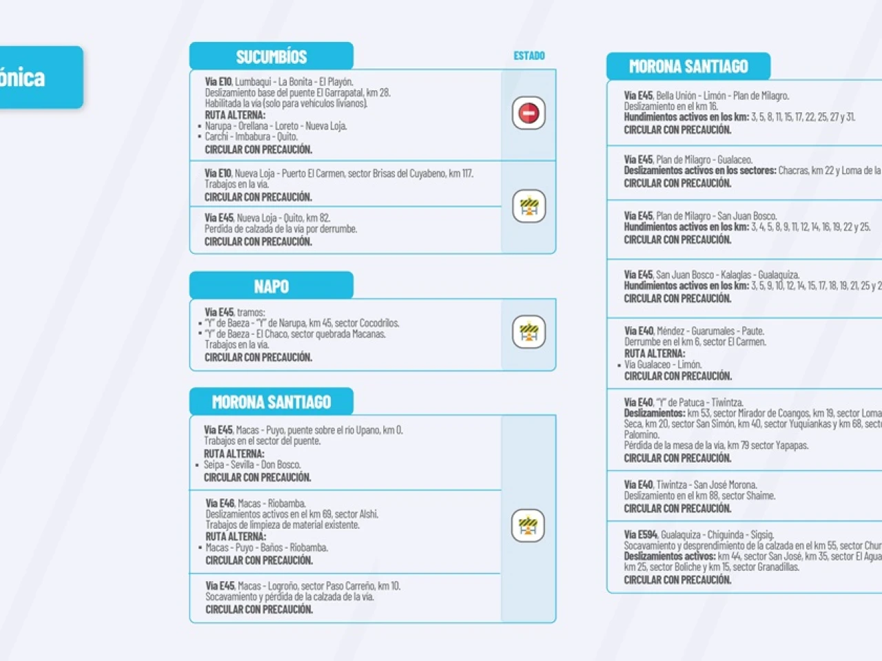 Vía E40: “Y” de Patuca-Tiwintza. Deslizamientos, km 53, Sector Mirador de Coangos, km 19 sector Loma Seca, km 12 Sector San Simón, km 40 sector Yuquiankas, km 68 sector Palomnino. Pérdida de la mesa de la vía, km 79 sector Yapapas. Circular con precaución.