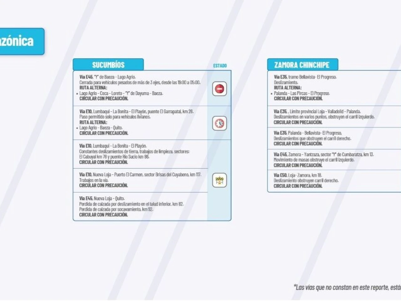 Vía E45: Pérdida de calzada: “Y” de Baeza - “Y” de Narupa, sector Cocodrilos Km 45. “Y” de Baeza-El Chaco, sector quebrada Macanas. “Y” de Baeza-El Reventador-Nueva Loja, sector Santa Rosa-Tres Cruces. Circular con Precaución.