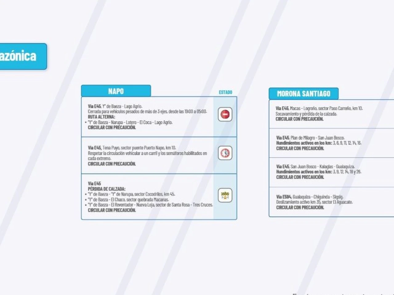Vía E45: Pérdida de calzada: “Y” de Baeza - “Y” de Narupa, sector Cocodrilos Km 45. “Y” de Baeza-El Chaco, sector quebrada Macanas. “Y” de Baeza-El Reventador-Nueva Loja, sector Santa Rosa-Tres Cruces. Circular con Precaución.