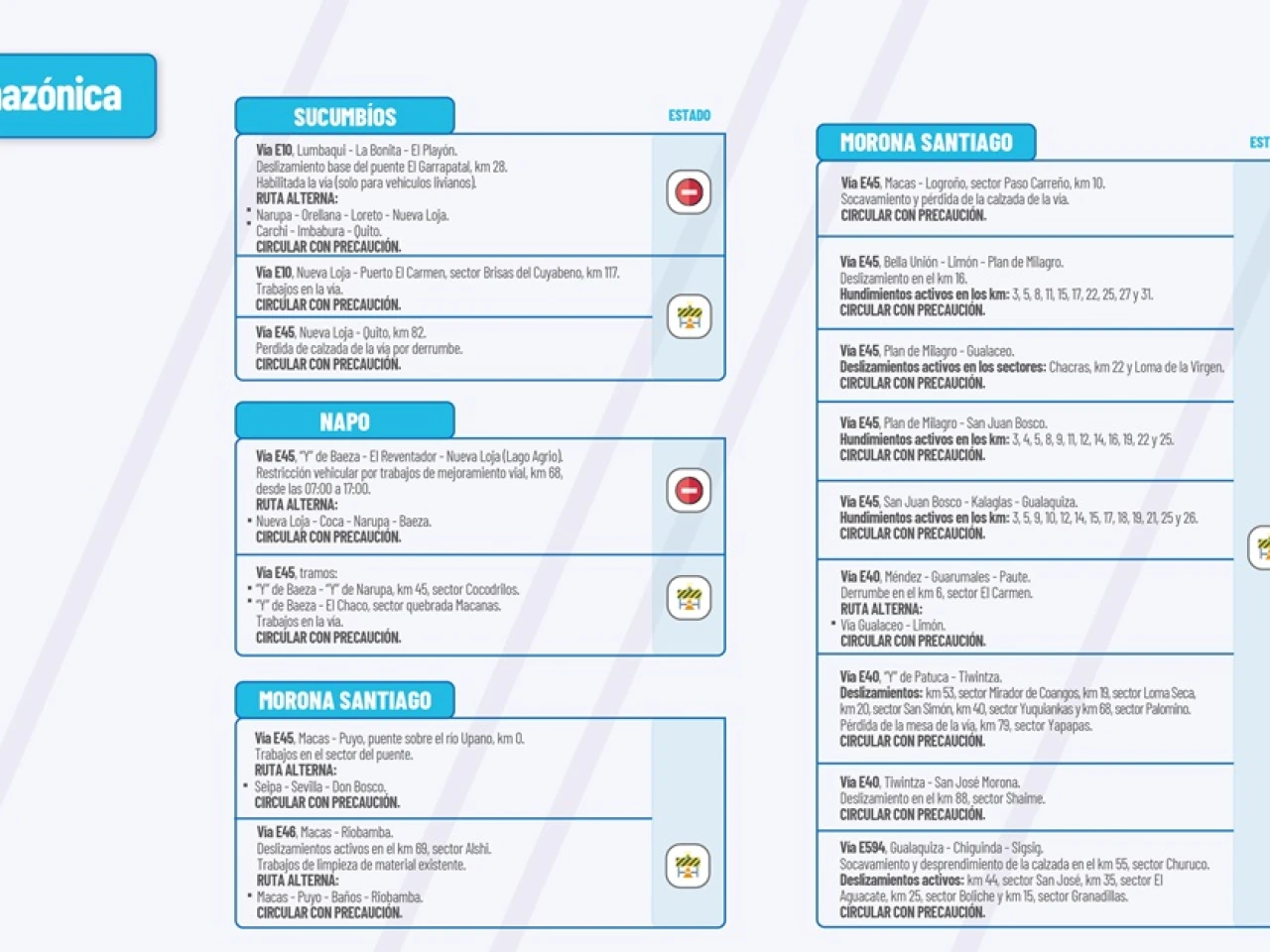Vía E40: “Y” de Patuca-Tiwintza. Deslizamientos, km 53, Sector Mirador de Coangos, km 19 sector Loma Seca, km 12 Sector San Simón, km 40 sector Yuquiankas, km 68 sector Palomnino. Pérdida de la mesa de la vía, km 79 sector Yapapas. Circular con precaución.