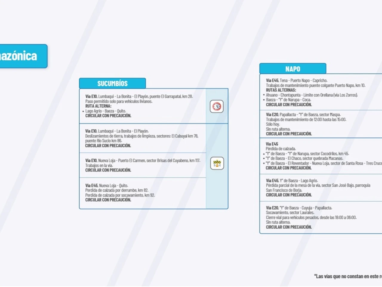 VIA E45: Pérdida de calzada. “Y” de Baeza-“Y” de Narupa, secgor Cocodrilos, km 45. “Y” de Baeza-El Chaco, sector quebrada Macanas. “Y” de Baeza-El Reventador-Nueva Loja, sector de Santa Rosa-res Cruces Circular con precaución.