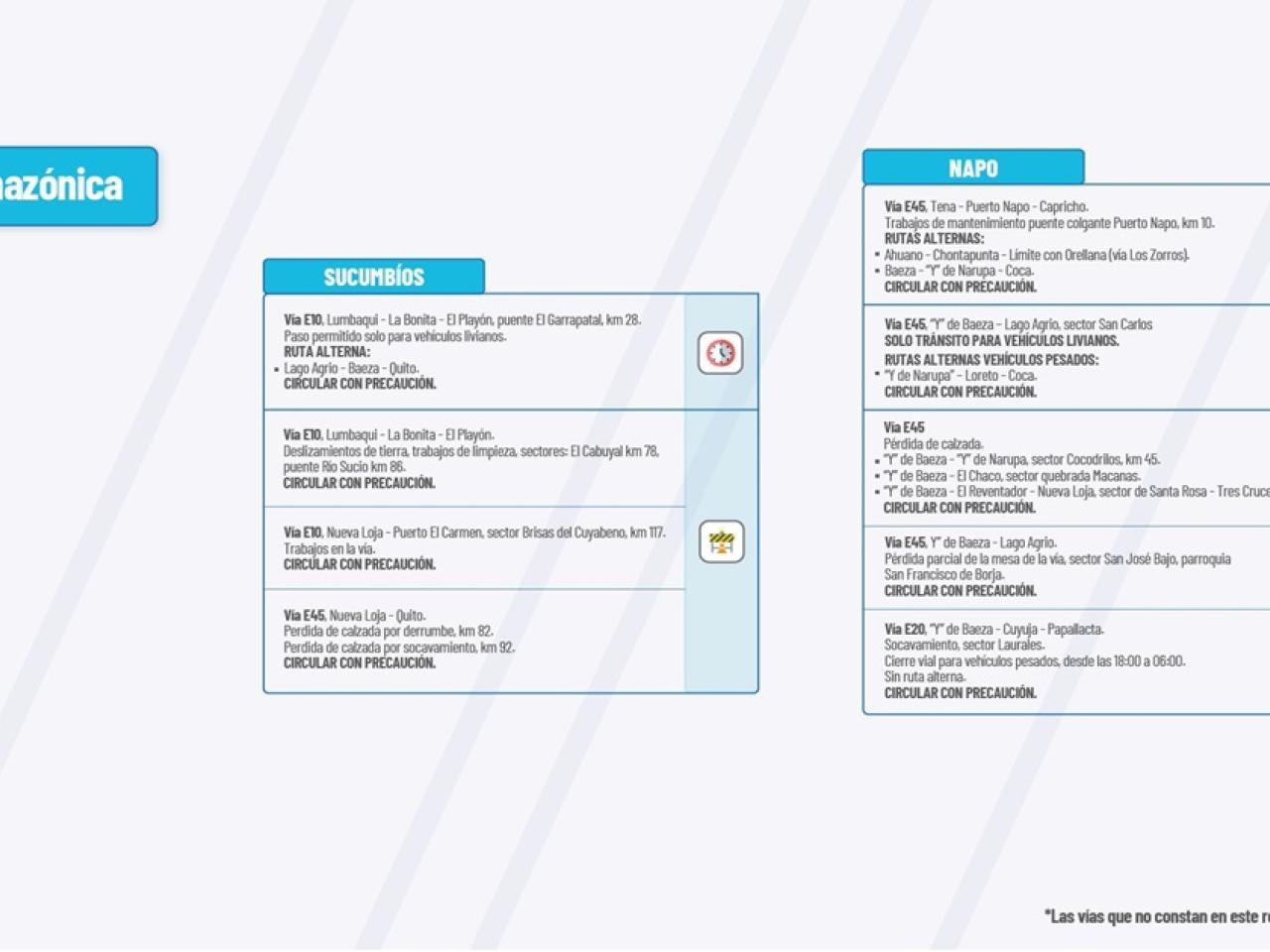 VIA E45: Pérdida de calzada. “Y” de Baeza-“Y” de Narupa, secgor Cocodrilos, km 45. “Y” de Baeza-El Chaco, sector quebrada Macanas. “Y” de Baeza-El Reventador-Nueva Loja, sector de Santa Rosa-res Cruces Circular con precaución.