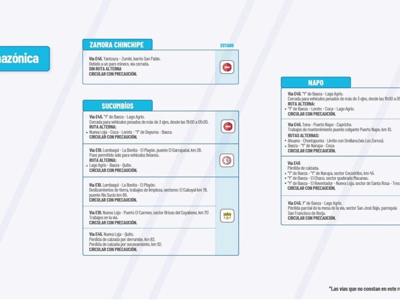 VIA E45:?Pérdida de calzada. “Y” de Baeza-“Y” de Narupa, secgor Cocodrilos, km 45.? “Y” de Baeza-El Chaco, sector quebrada Macanas.? “Y” de Baeza-El Reventador-Nueva Loja, sector de Santa Rosa-res Cruces Circular con precaución.?