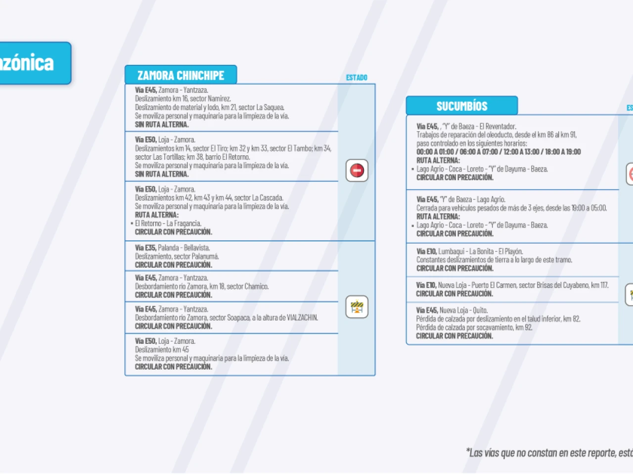 Vía E45: “Y” de Baeza-El Reventador. Trabajos de reparación de oleoducto desde el km 86 al km91, paso controlado en los siguientes horarios: 00:00 a 01:00/ 06:00 a 07:00/ 12:00 a 13:00/ 18:00 a 19:00.