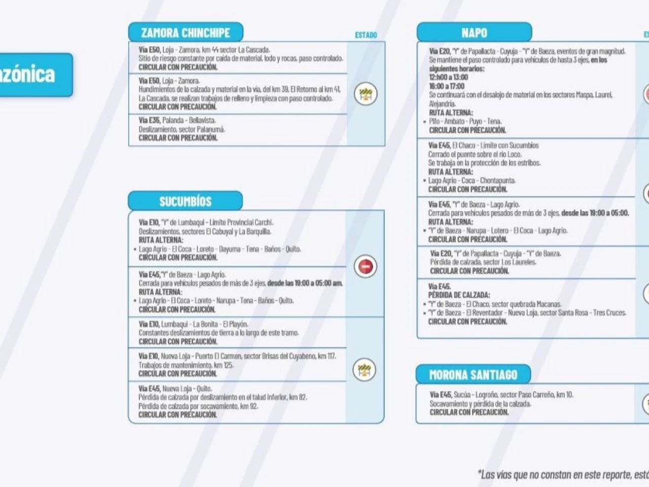 Quito- El Ministerio de Transporte y Obras Públicas (MTOP) en su cuenta de X publica el estado de las vías de la Amazonía ecuatoriana. A continuación, compartimos información que le podría interesar.