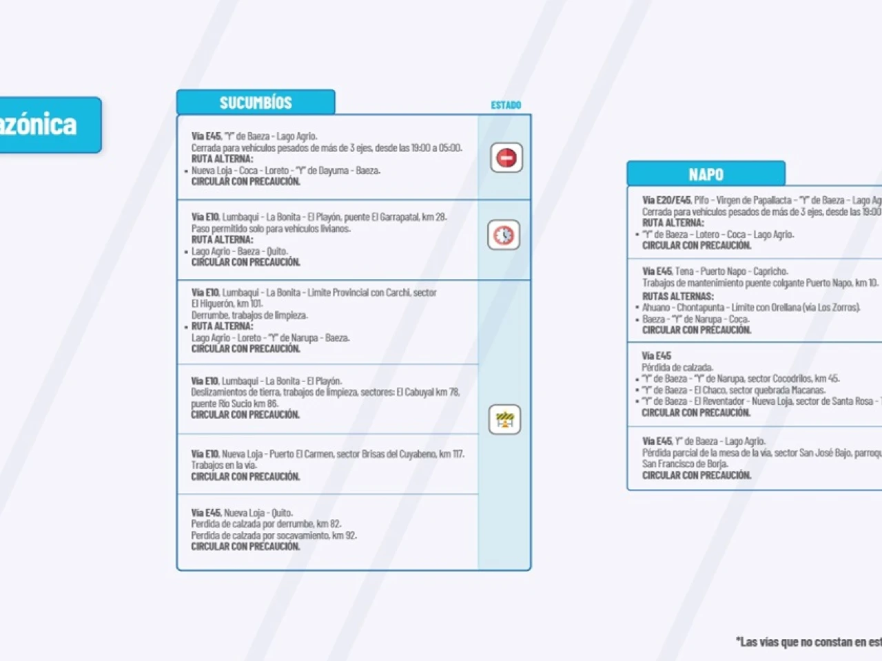 Vía E10: Lumbaqui-La Bonita-El Playón. Deslizamientos de tierra, trabajos de limpieza sectores: El Cabuyal km 78, puente Río Sucion Km 86. Circular con precaución.