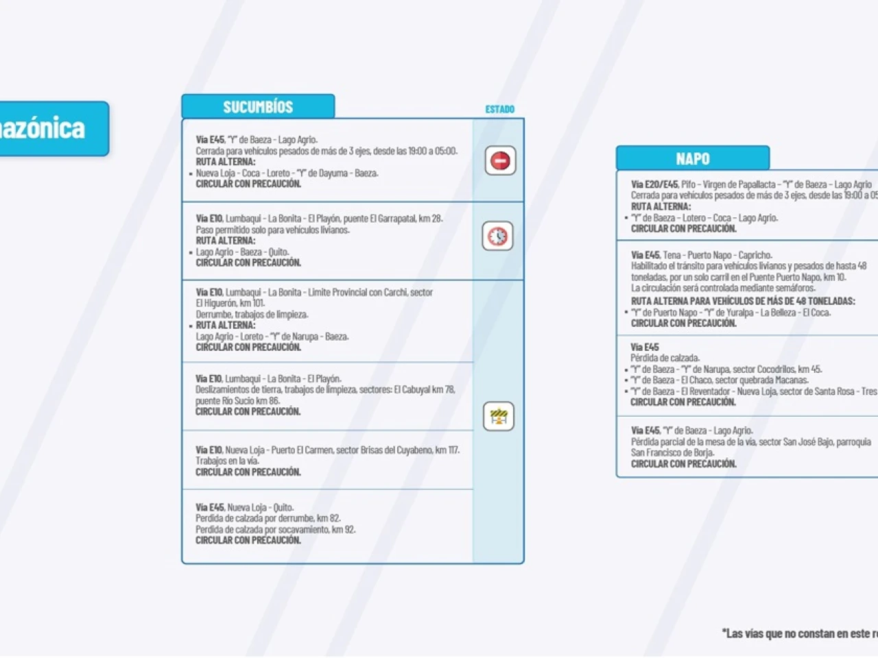 VIA E45:?Pérdida de calzada. “Y” de Baeza-“Y” de Narupa, sector Cocodrilos, km 45.? “Y” de Baeza-El Chaco, sector quebrada Macanas.? “Y” de Baeza-El Reventador-Nueva Loja, sector de Santa Rosa-res Cruces Circular con precaución.?