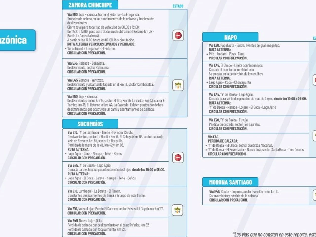 Vía E50: Loja-Zamora. Deslizamiento en los km 15, sector El Tiro; km 25, km 33, sector El Tambo, km 39, El Retorno al km 44, La Cascada. Existen puntos donde hay deslizamientos que obstruyen un carril y asentamientos de calzada. Circular con precaución.