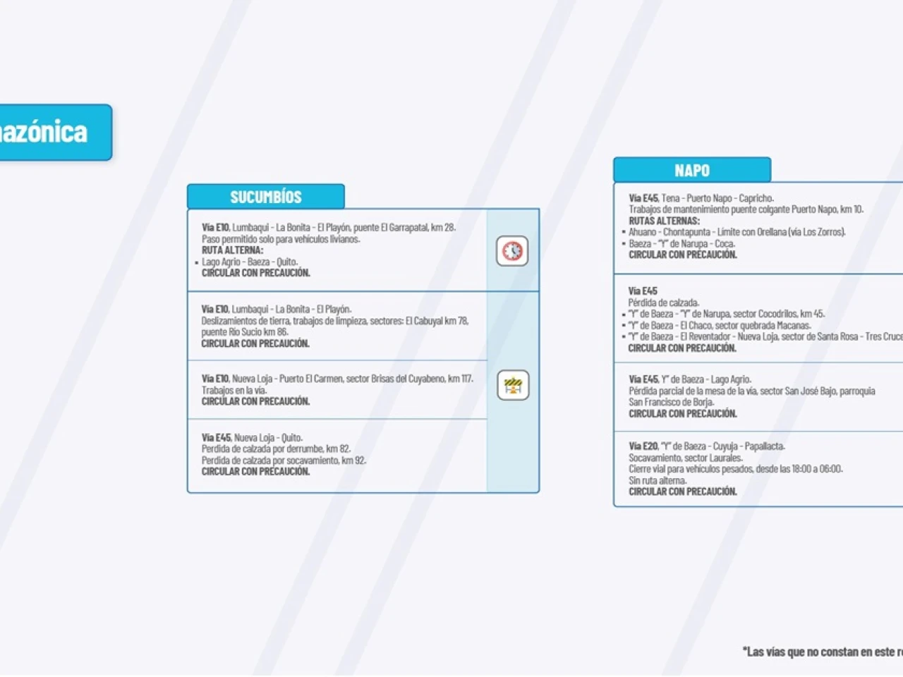 VIA E45: Pérdida de calzada. “Y” de Baeza-“Y” de Narupa, secgor Cocodrilos, km 45. “Y” de Baeza-El Chaco, sector quebrada Macanas. “Y” de Baeza-El Reventador-Nueva Loja, sector de Santa Rosa-res Cruces Circular con precaución.