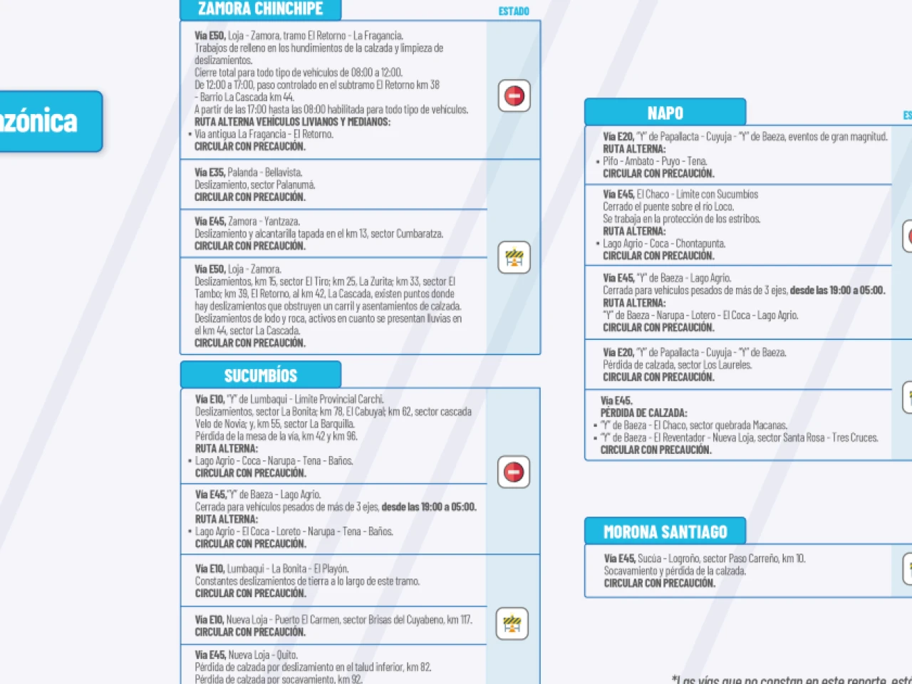 Quito- El Ministerio de Transporte y Obras Públicas (MTOP) en su cuenta de X publica el estado de las vías de la Amazonía ecuatoriana. A continuación, compartimos información que le podría interesar.