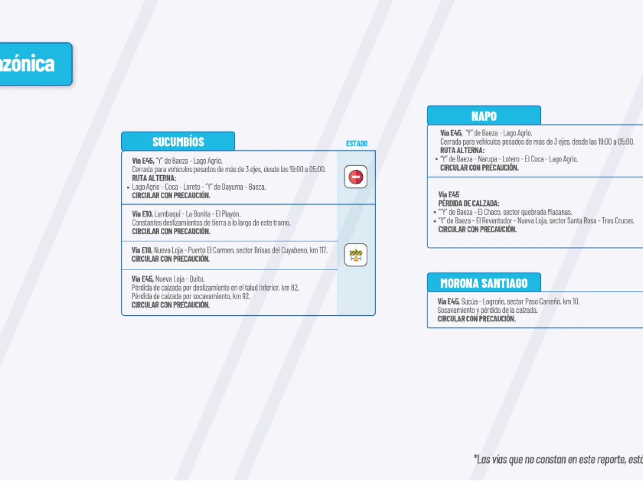 Vía E45: Pérdida de calzada “Y” de Baeza-El Chaco, sector quebrada Macanas. “Y” de Baeza-El Reventador-Nueva Loja, sector Santa Rosa-Tres Cruces. “Y” de Baeza – El Reventador-Nueva Loja. Deslizamientos sector San Carlos. Circular con precaución.
