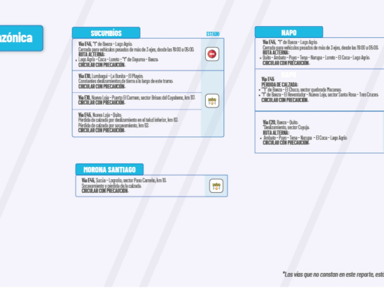 Vía E10: Lumbaqui-La Bonita-El Playón. Constantes deslizamientos de tierra a lo largo de este tramo. Circular con precaución.