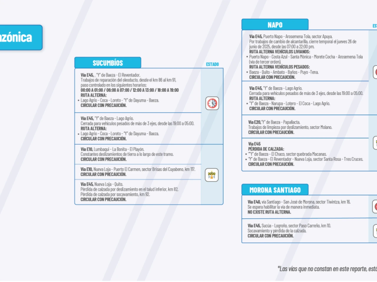 Vía E45: “Y” de Baeza-El Reventador. Trabajos de reparación de oleoducto desde el km 86 al km91. La vía se mantendrá cerrada hasta el viernes 20 de junio de 20’25. Desde el sábado 21 al lunes 23 de junio de 2025, se dará paso controlado en los siguientes horarios: 00:00 a 01:00/ 06:00 a 07:00/ 12:00 a 13:00/ 18:00 a 19:00.