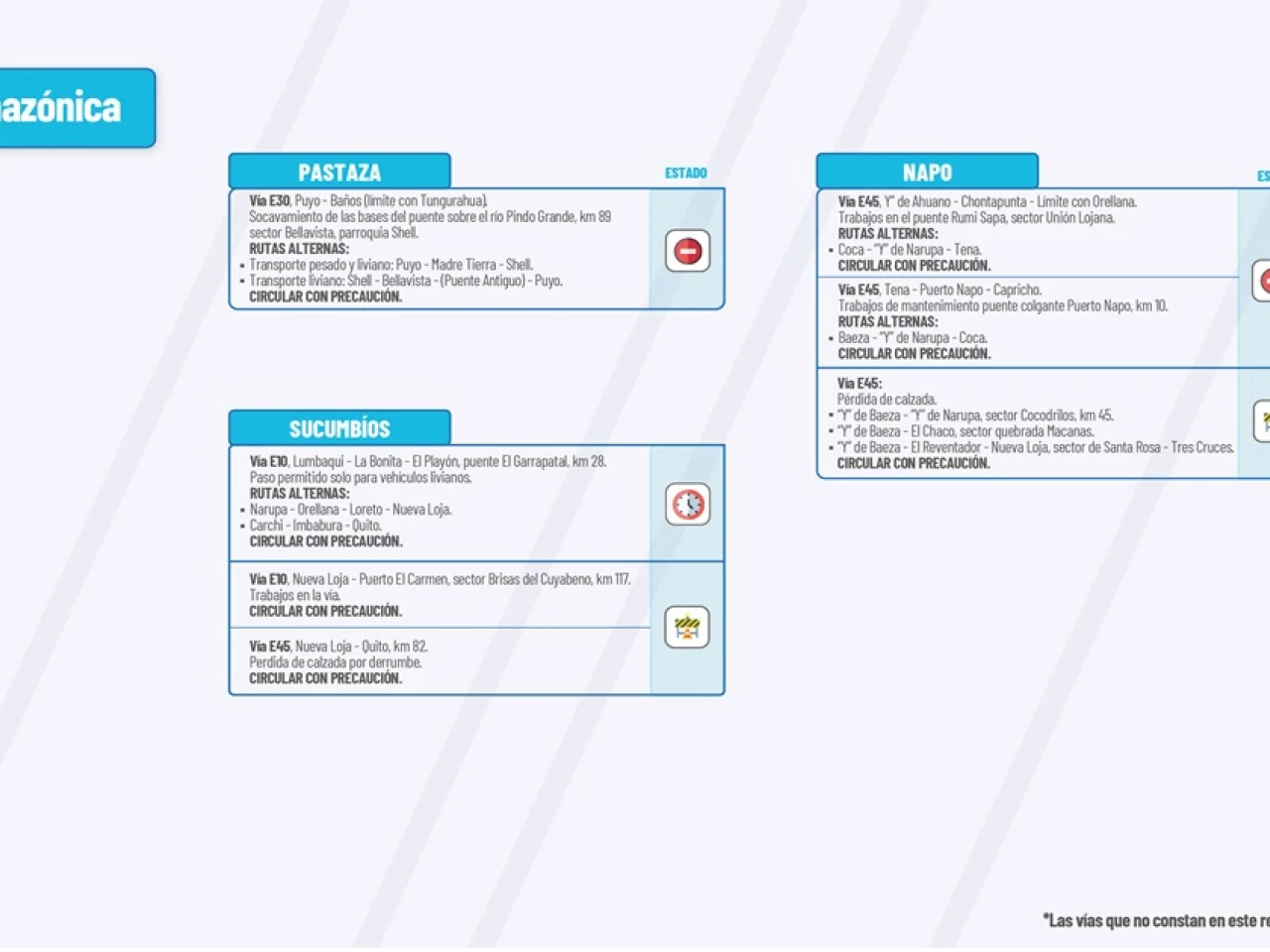 Vía E45: Bella Unión-Limón-Plan de Milagro. Deslizamiento km 16. Hundimientos activos: km 3, km 5, km 8, km 11, km 15, km 17, km 22, km 25, km 27 y km 31. Circular con precaución.