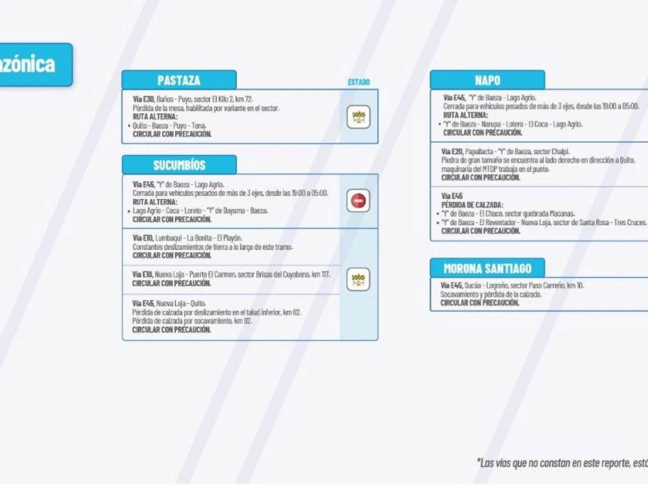 vias carreteras provincia de Napo provincia de Pastaza Provincia de Sucumbios Informe vial Provincia de Morona SantiagoSíguenos en: