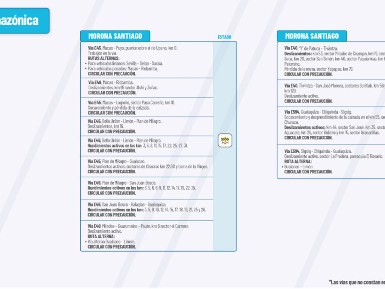 Vía E45: San Juan Bosco-Kalaglas-Gualaquiza. Hundimientos activos: km2, km5 km 9, km 10, km 12, km 14, km 15, km 17, km 18, km 19, km 21, km 25, y km 26. Circular con Precaución.