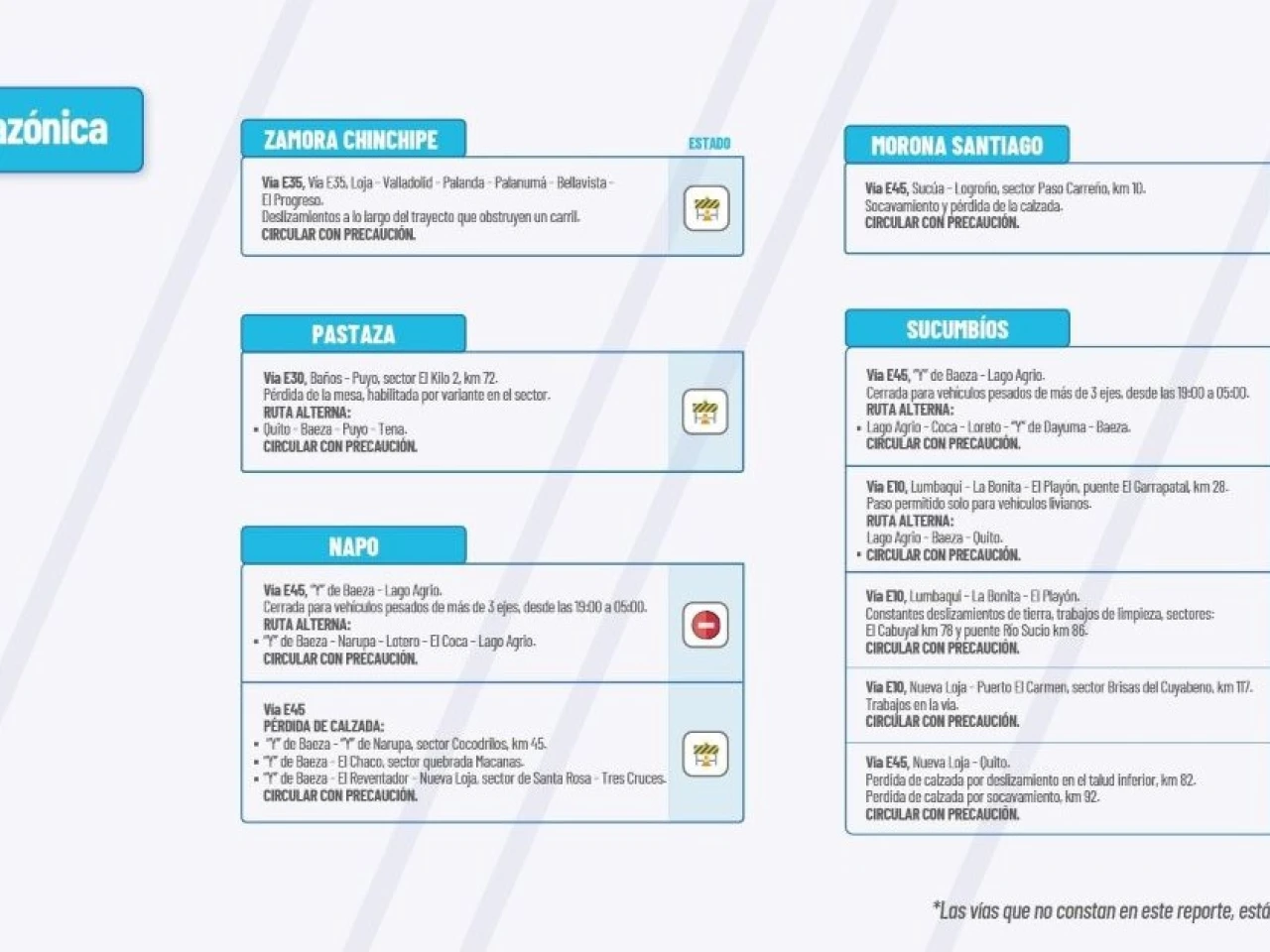 Vía E10:?Lumbaqui-La Bonita-El Playón. Constantes deslizamientos de tierra, trabajos de limpieza sectores: El Cabuyal km 78, puente Río Sucio Km 86. Circular con precaución.