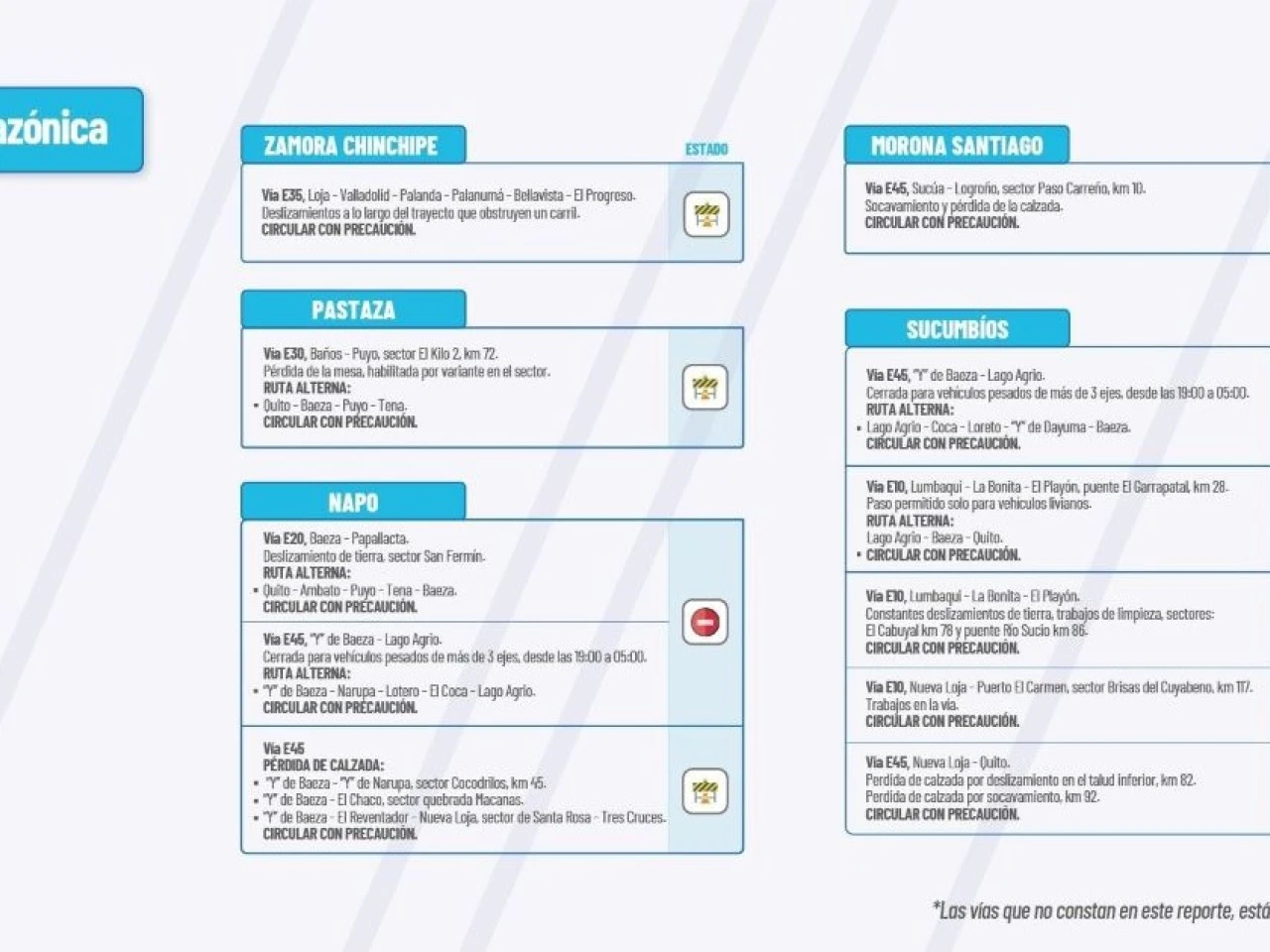 Vía E45: Pérdida de calzada “Y” de Narupa, sector Cocodrilos Km 45. “Y” de Baeza-El Chaco, sector quebrada Macanas.  “Y” de Baeza-El Reventador-Nueva Loja, sector Santa Rosa-Tres Cruces. Circular con precaución.