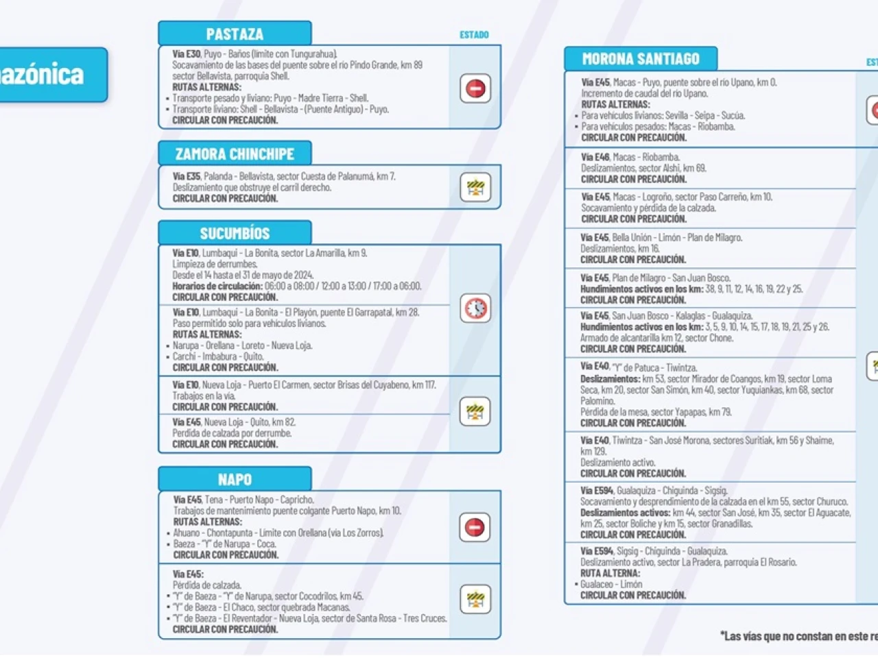 Vía E40: “Y” de Patuca-Tiwintza. Deslizamientos, km 53, Sector Mirador de Coangos, km 19 sector Loma Seca, km 12 Sector San Simón, km 40 sector Yuquiankas, km 68 sector Palomnino. Pérdida de la mesa de la vía, km 79 sector Yapapas. Circular con precaución.