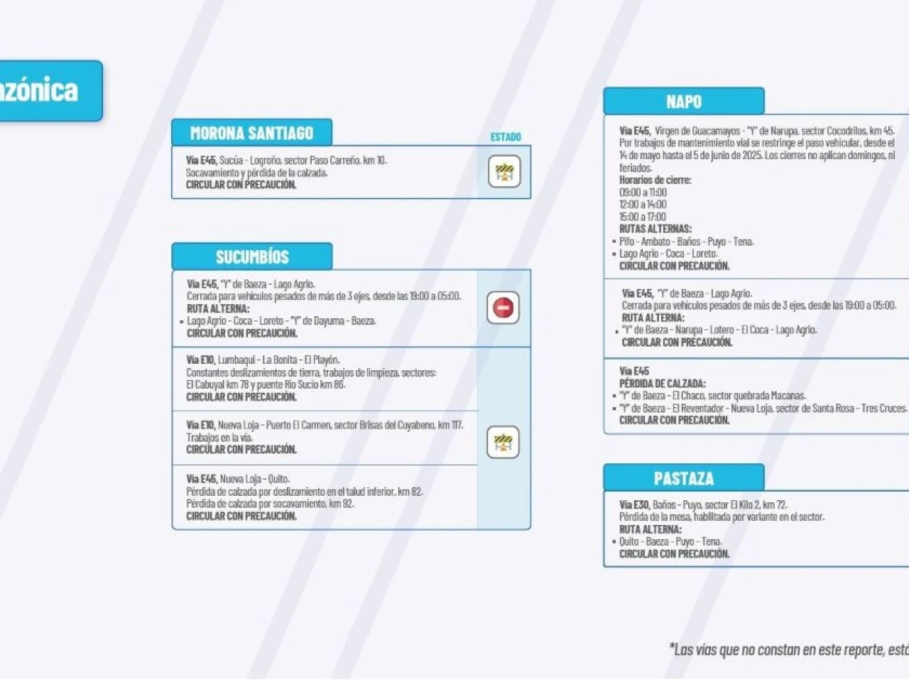 Vía E45: “Y” de Baeza-Lago Agrio. Cerrada para vehículos pesados de más de 3 ejes, desde las 19H00 a 05H00. Ruta Alterna: Lago Agrio-Coca-Loreto- “Y” de Dayuma-Baeza. Circular con precaución.