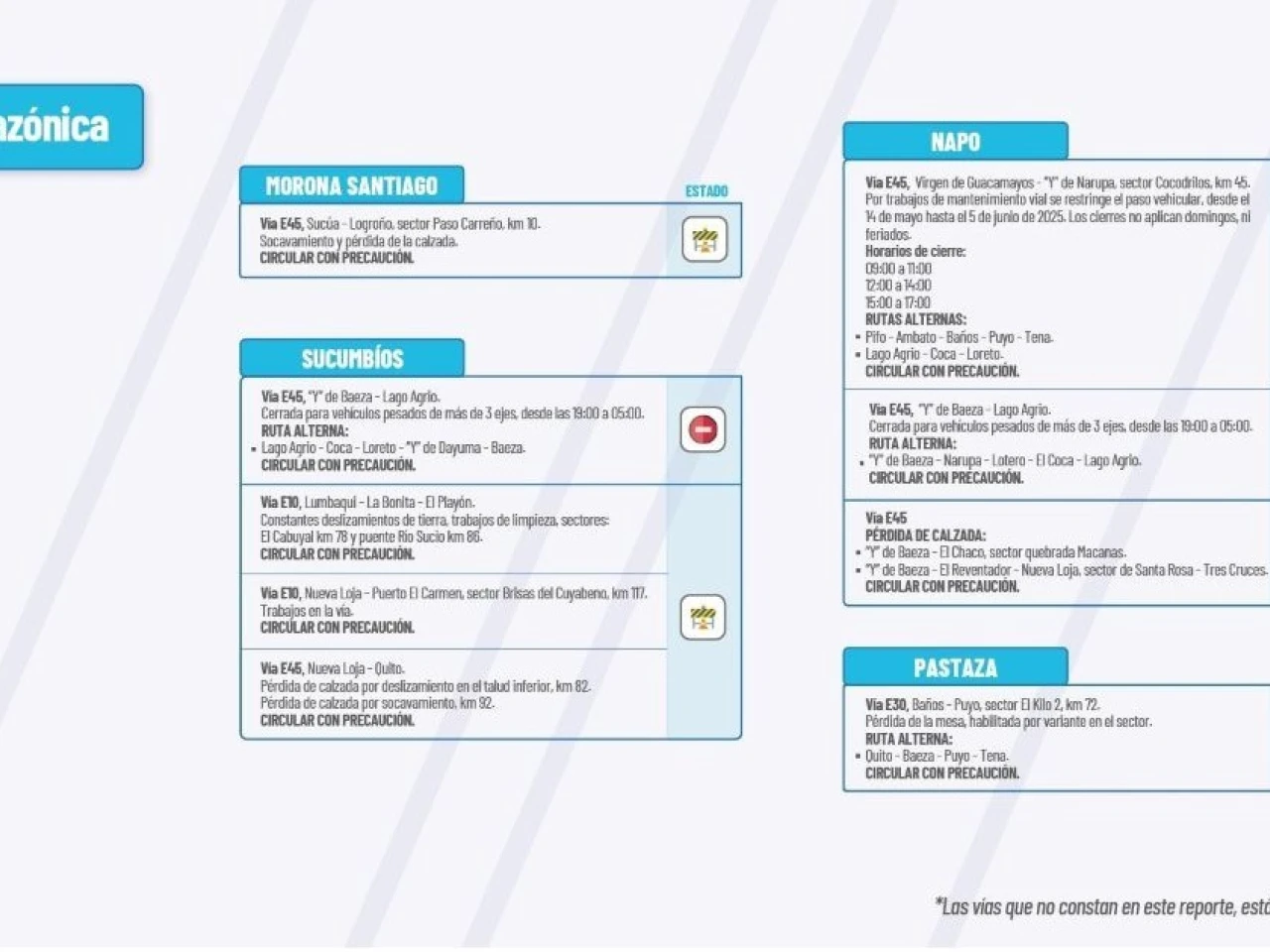 Vía E45: Virgen del Guacamayos – Y de Narupa, sector Cocodrilos, Km. 45. Por trabajos de mantenimiento vial se restringe el paso vehicular, desde el 14 de mayo hasta el 5 de junio de 2025. Los cierres no aplican domingos y feriados. Horario de cierre: de 09h00 a 11h00 / de 12h00 a 14h00 / 15h00 a 17h00. Rutas alternas: Pifo – Ambato - Baños - Puyo – Tena. Otra Ruta: Lago Agrio – Coca – Loreto. Circular con precaución.