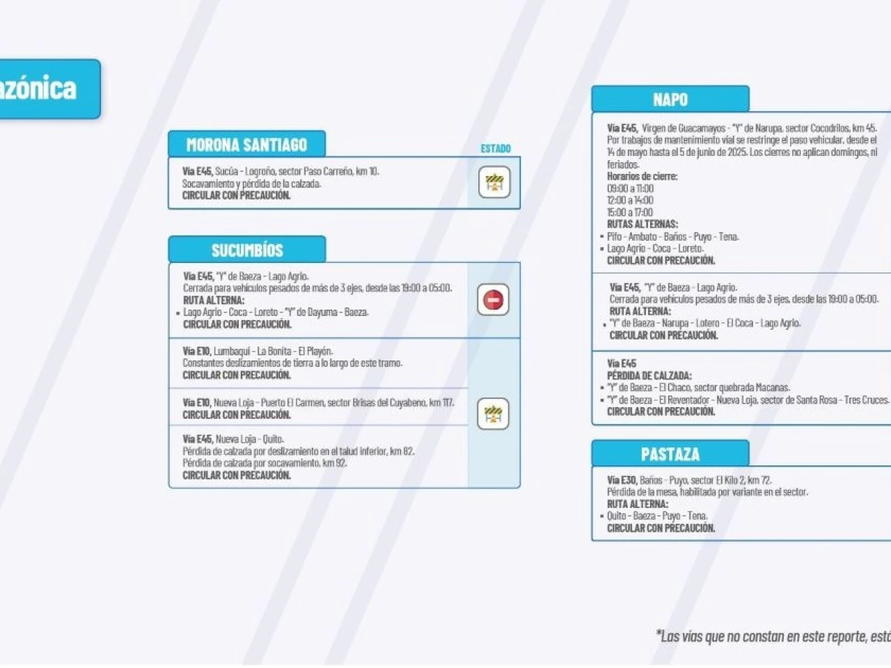 Vía E45: Pérdida de calzada: “Y” de Baeza - “Y” de Narupa, sector Cocodrilos Km 45. “Y” de Baeza-El Chaco, sector quebrada Macanas. “Y” de Baeza-El Reventador-Nueva Loja, sector Santa Rosa-Tres Cruces. Circular con Precaución.