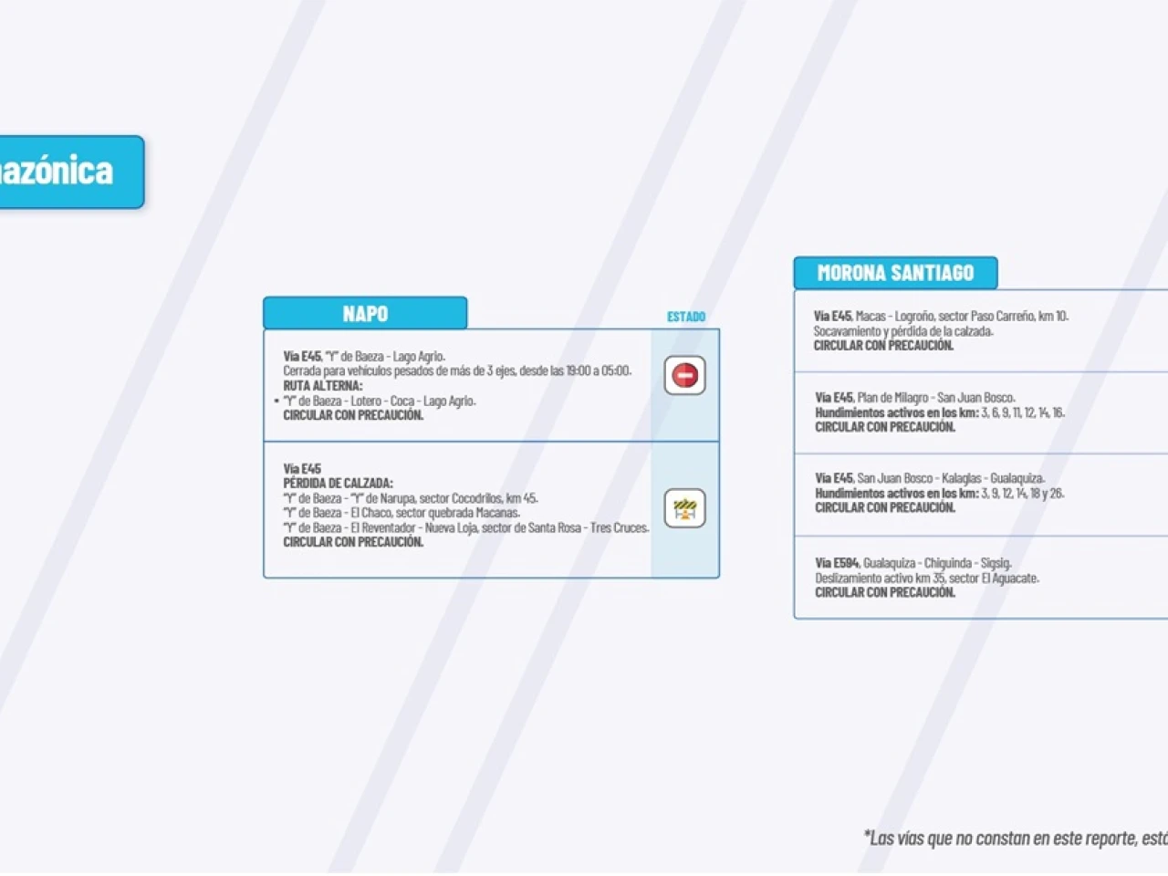 Vía E45: Pérdida de calzada: “Y” de Baeza -“Y” de Narupa, sector Cocodrilos Km 45. “Y” de Baeza-El Chaco, sector quebrada Macanas. “Y” de Baeza-El Reventador-Nueva Loja, sector Santa Rosa-Tres Cruces. Circular con Precaución.
