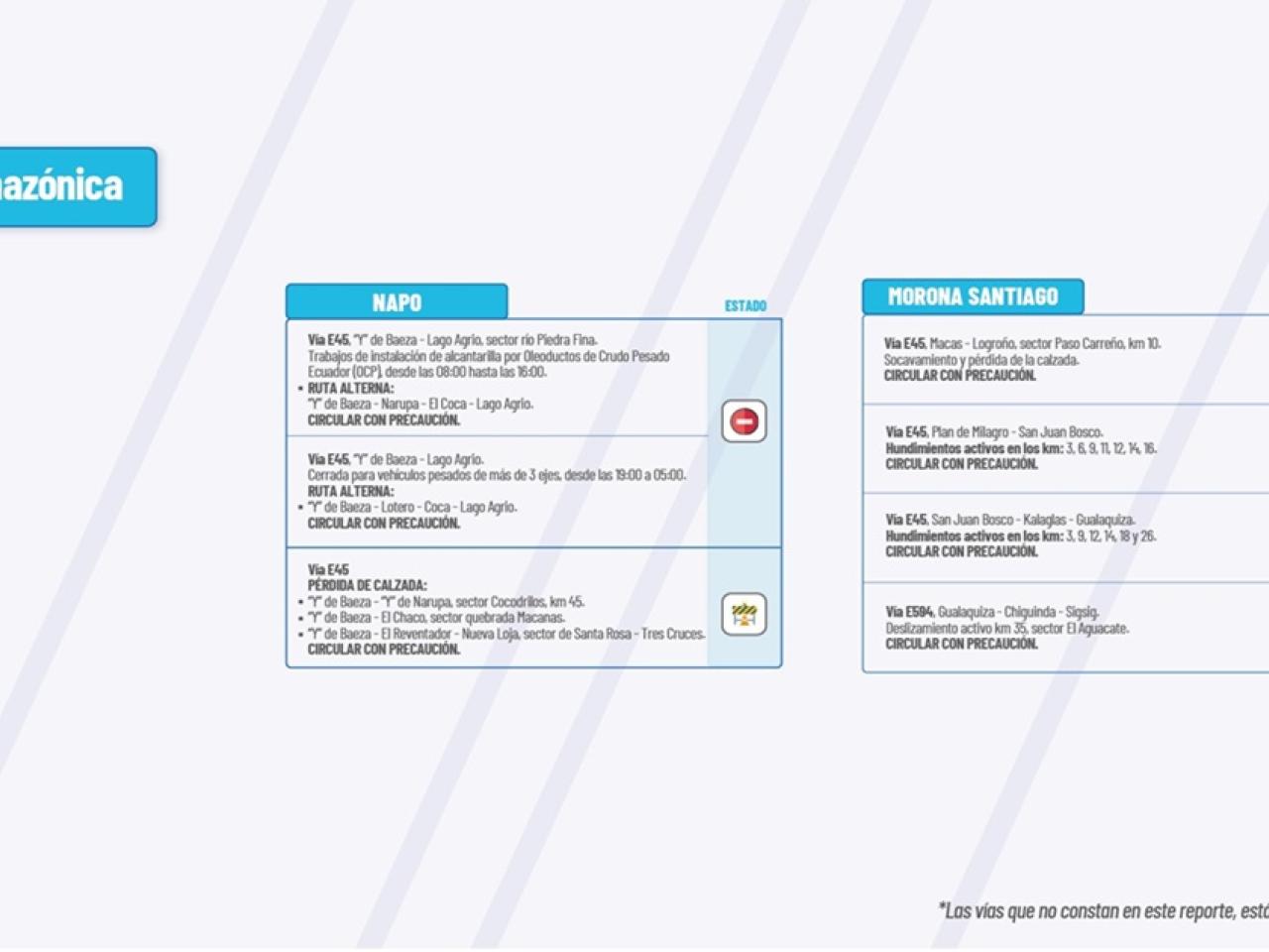 Vía E45: Pérdida de calzada: “Y” de Baeza -“Y” de Narupa, sector Cocodrilos Km 45. “Y” de Baeza-El Chaco, sector quebrada Macanas. “Y” de Baeza-El Reventador-Nueva Loja, sector Santa Rosa-Tres Cruces. Circular con Precaución.