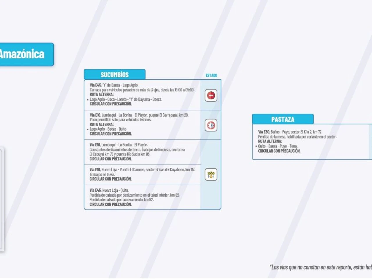 Vía E45: Pérdida de calzada: “Y” de Baeza -“Y” de Narupa, sector Cocodrilos Km 45. “Y” de Baeza-El Chaco, sector quebrada Macanas. “Y” de Baeza-El Reventador-Nueva Loja, sector Santa Rosa-Tres Cruces. Circular con Precaución.