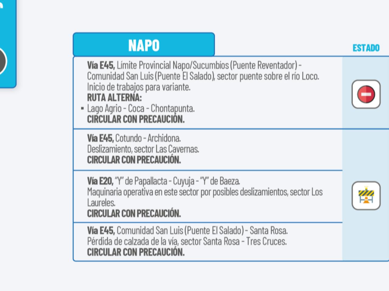 Vía E45: Nueva Loja-Quito. Socavamiento, km 48 (Cascales). Cambio de tubería, km 72 (recinto Atenas). Pérdida de calzada por deslizamiento en el talud inferior, km 82. Pérdida de calzada por socavamiento, km 92. Circular con precaución.