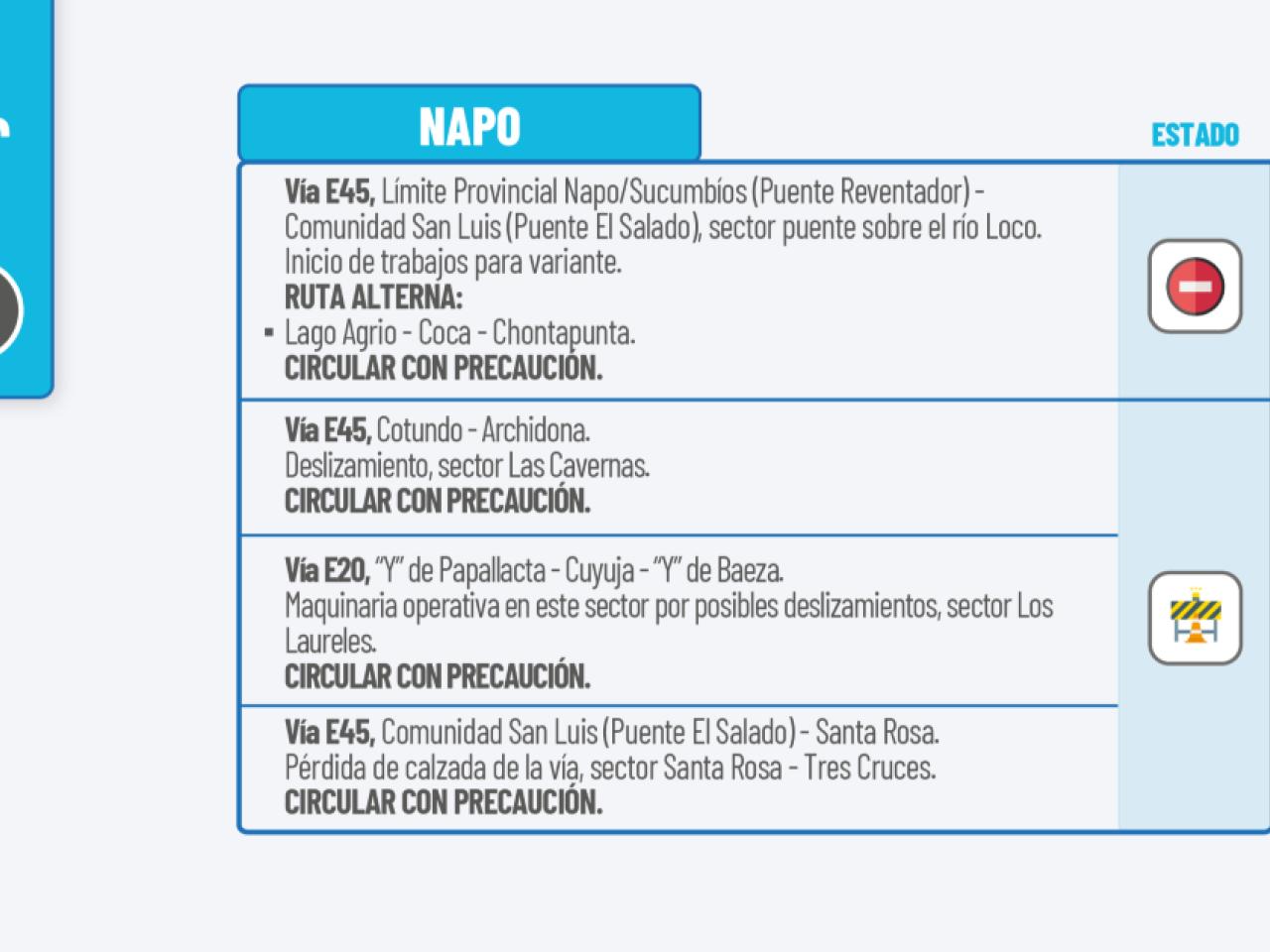 Vía E45: Nueva Loja-Quito. Socavamiento, km 48 (Cascales). Cambio de tubería, km 72 (recinto Atenas). Pérdida de calzada por deslizamiento en el talud inferior, km 82. Pérdida de calzada por socavamiento, km 92. Circular con precaución.