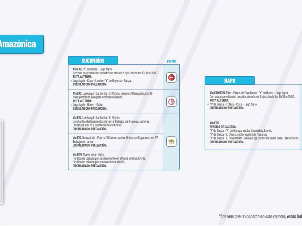 Vía E45: Pérdida de calzada: “Y” de Baeza -“Y” de Narupa, sector Cocodrilos Km 45. “Y” de Baeza-El Chaco, sector quebrada Macanas. “Y” de Baeza-El Reventador-Nueva Loja, sector Santa Rosa-Tres Cruces. Circular con Precaución.