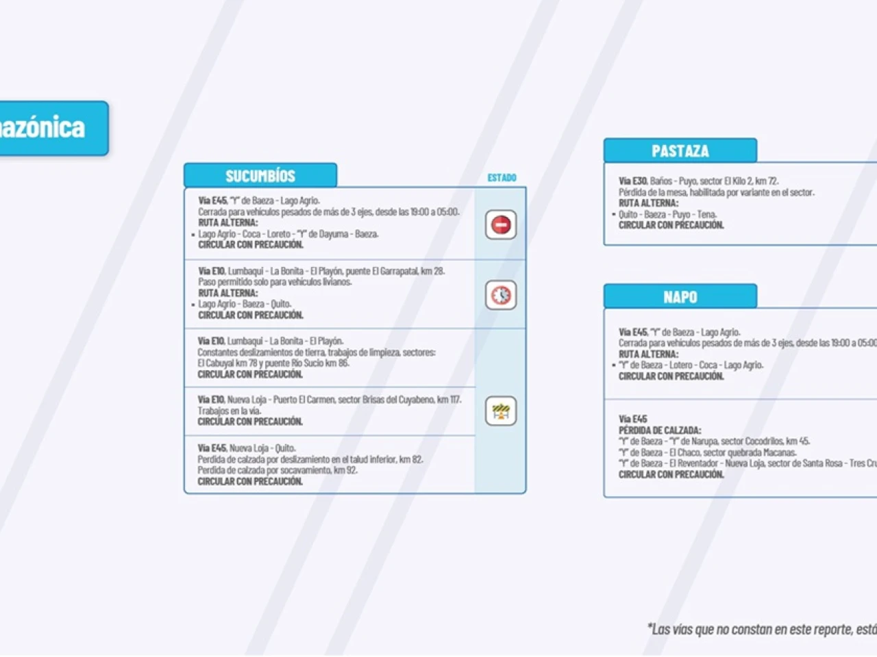 El Ministerio de Transporte y Obras Públicas (MTOP) en su cuenta de X publica el estado de las vías de la Amazonía ecuatoriana. A continuación, compartimos información que le podría interesar.