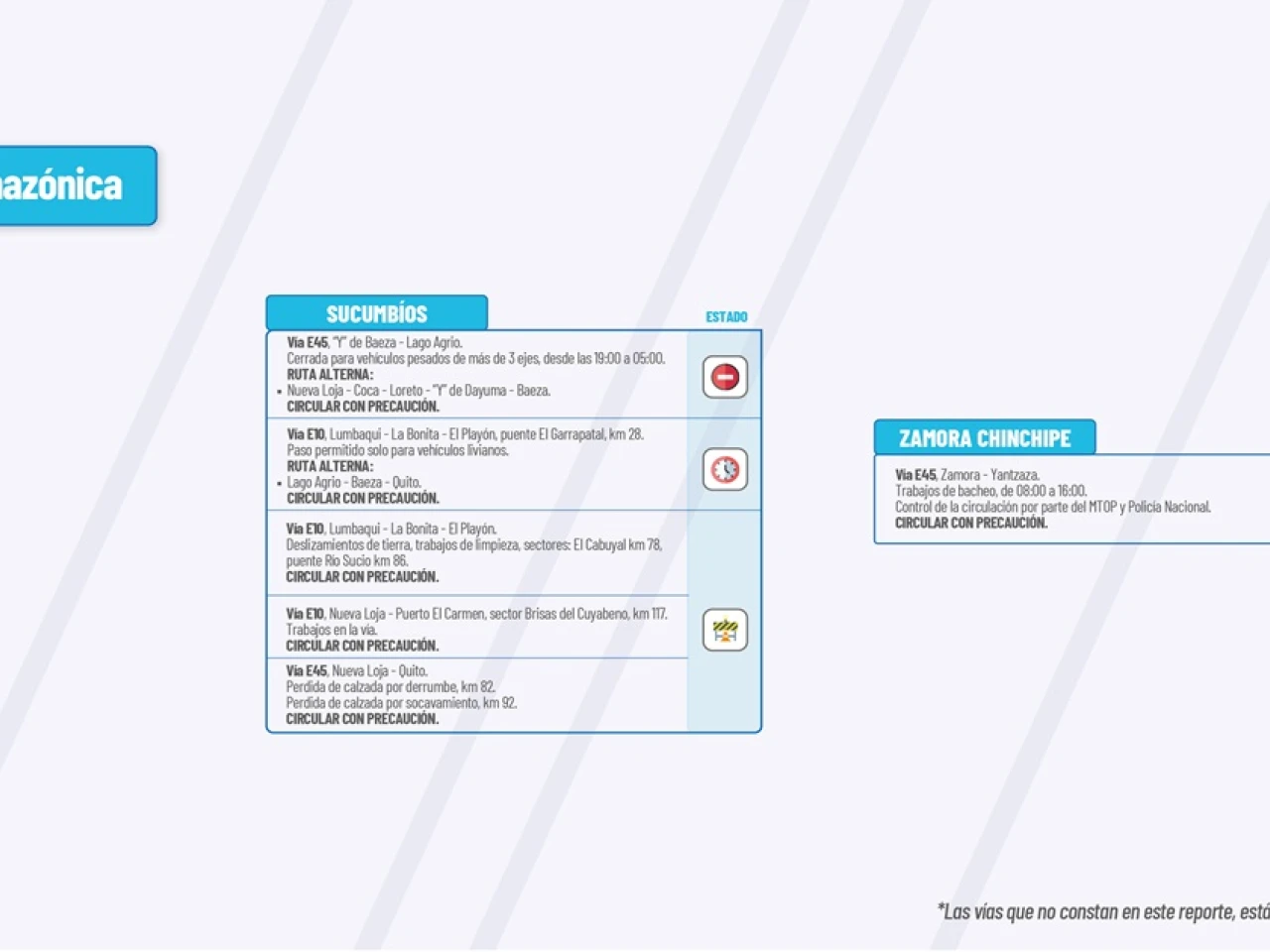 Vía E10:?Lumbaqui-La Bonita-El Playón. Deslizamientos de tierra, trabajos de limpieza sectores: El Cabuyal km 78, puente Río Sucio Km 86. Circular con precaución.