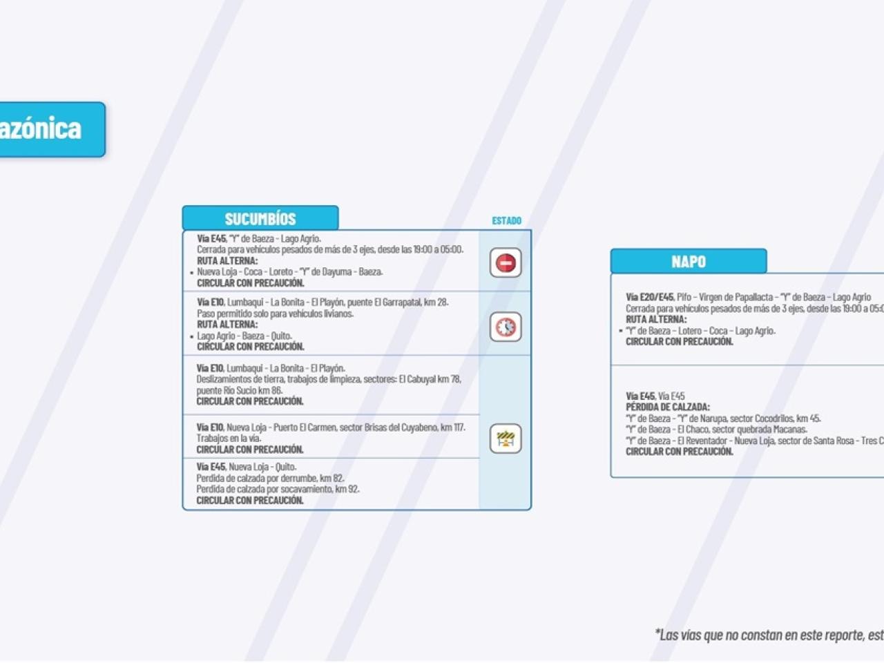 Vía E45: Pérdida de calzada: “Y” de Baeza-“Y” de Narupa, sector Cocodrilos Km 45. “Y” de Baeza-El Chaco, sector quebrada Macanas. “Y” de Baeza-El Reventador-Nueva Loja, sector Santa Rosa-Tres Cruces. Deslizamiento: “Y” de Baeza-“Y” de Narupa, sector las Peceras. Circular con Precaución.