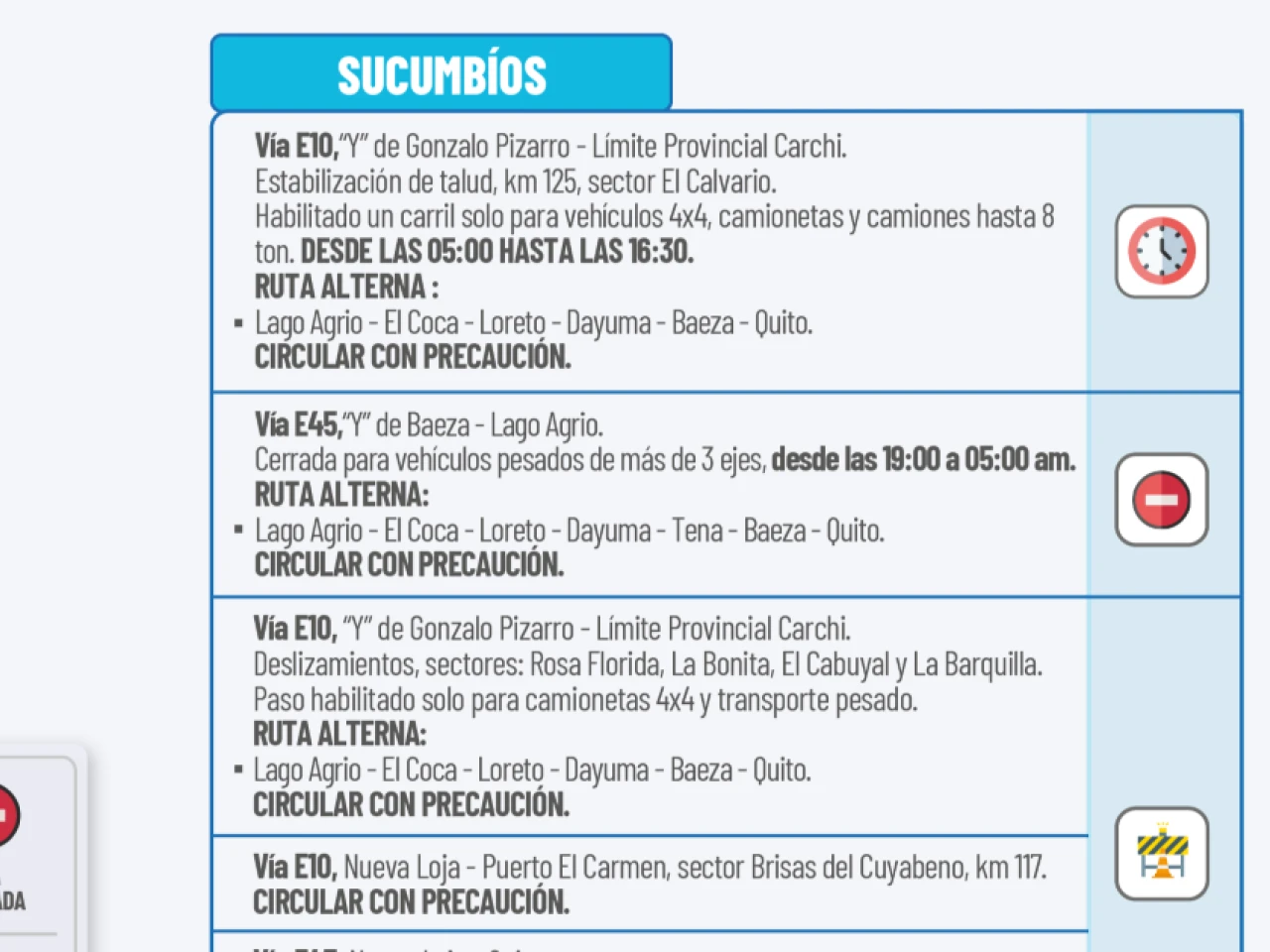 Vía E10: “Y” de Gonzalo Pizarro-Límite Provincial Carchi. Deslizamientos, sectores: Rosa Florida, La Bonita, El Cabuyal y Barquilla, paso habilitado solo para camionetas 4x4 y transporte pesado.
