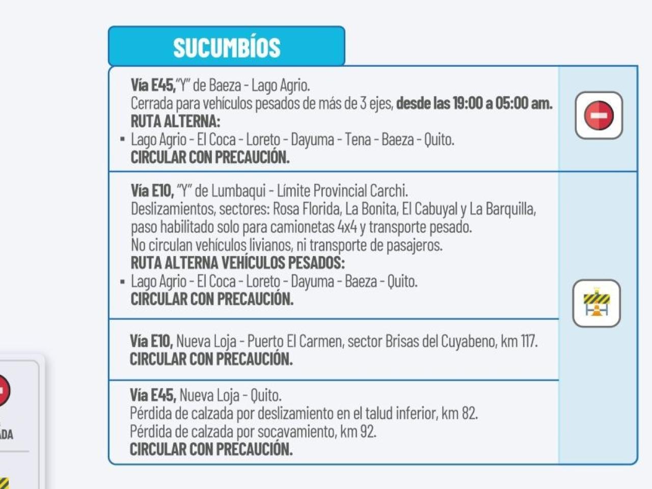 Vía E10: “Y” de Lumbaqui-Límite Provincial Carchi. Deslizamientos, sectores Rosa Florida, La Bonita, El Cabuya y La Barquilla, paso habilitado solo para camionetas 4x4 y transporte pesado. No circulan vehículos livianos, ni transporte de pasajero.