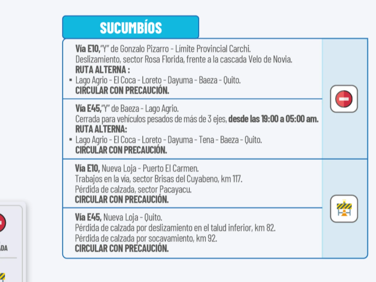 Vía E45: Nueva Loja-Quito. Pérdida de calzada por deslizamiento en el talud inferior, km 82 Pérdida de calzada por socavamiento km 92. Circular con precaución.
