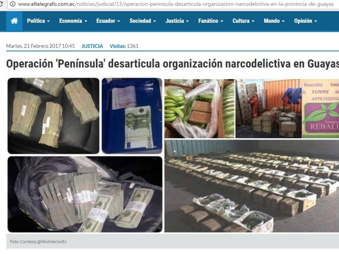 El pasado 20 de febrero, un día después de las elecciones de primera vuelta, decenas de policías y fiscales ejecutaron la operación Península, que desarticuló una red de narcotráfico que buscaba enviar 736 kilos de cocaína a Europa. Las autoridades incursionaron en seis viviendas en Guayaquil, Samborondón, Salinas; capturaron a seis personas, tres vehículos y cerca de UD$200.000.