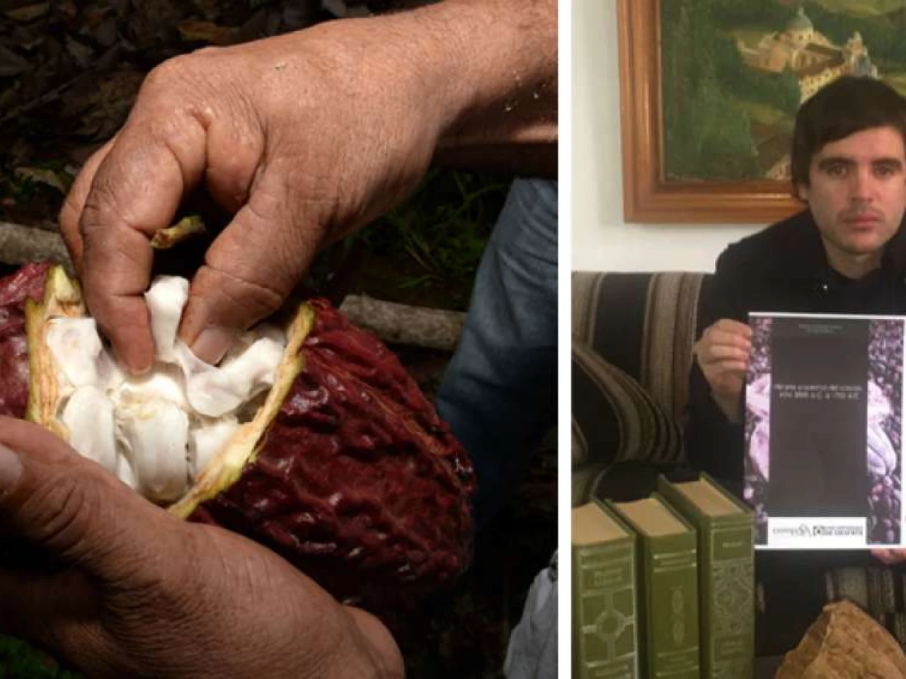 Por lo menos una variedad de Theobroma Cacao tiene su origen en la Alta Amazonía y ha sido utilizada en la región por más de 5.000 años. En la gráfica derecha, ?Roberto Ordóñez muestra la portada de su libro que presentará a mediados de este mes de mayo. Foto: El Telégrafo