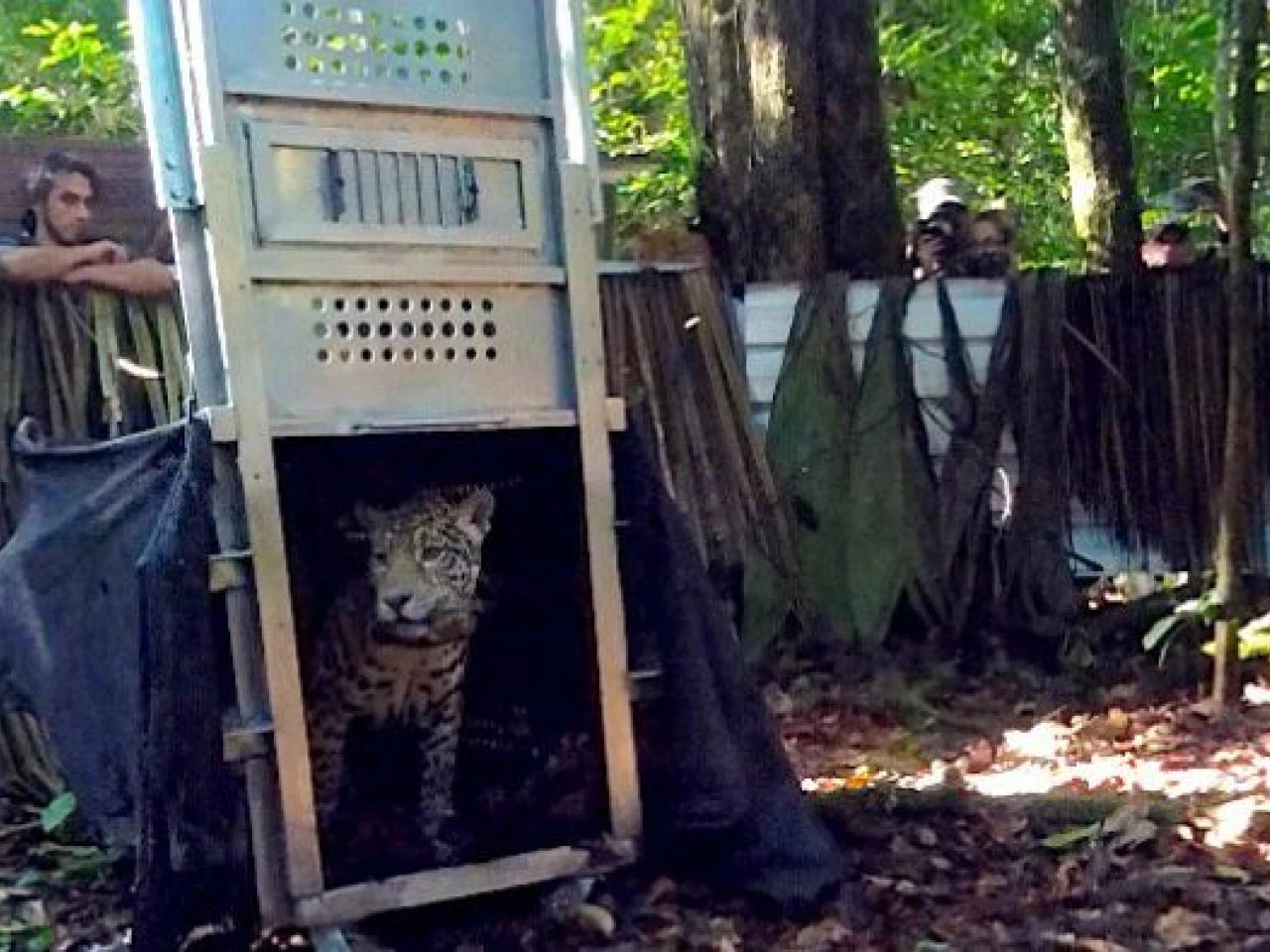Hace año y medio, la jaguar quedó cuadripléjica por uno de los 18 perdigones disparados por cazadores y que aplastó su médula espinal, pero tras operaciones y cuidados médicos recuperó su actividad y fue liberada con un collar rastreador.